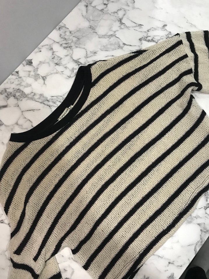 Gri ve beyaz çizgili, örme kumaştan yapılmış, kayık yaka ve uzun kollu, bol kesim kadın kazak. Günlük kullanıma uygundur.