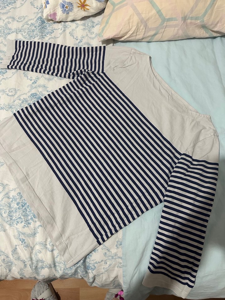 Pamuklu, uzun kollu ve salaş kesim olan bu hamile bluzu, tekne yaka ve gri beyaz çizgili desene sahiptir. Günlük kullanıma uygundur. mango orijinal yarım yol kayık yaka