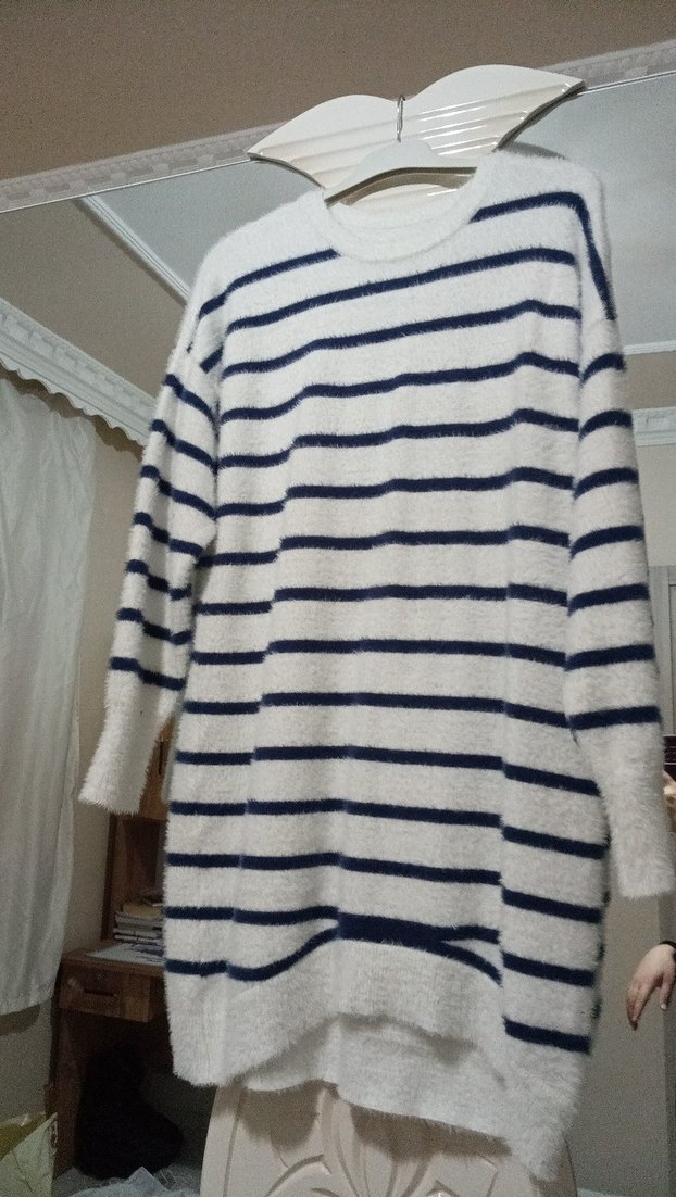 Uzun kollu, yuvarlak yakalı, gevşek kesim triko kazak e. Beyaz ve lacivert çizgili deseniyle rahat ve normcore tarzda, günlük kullanım için uygundur.