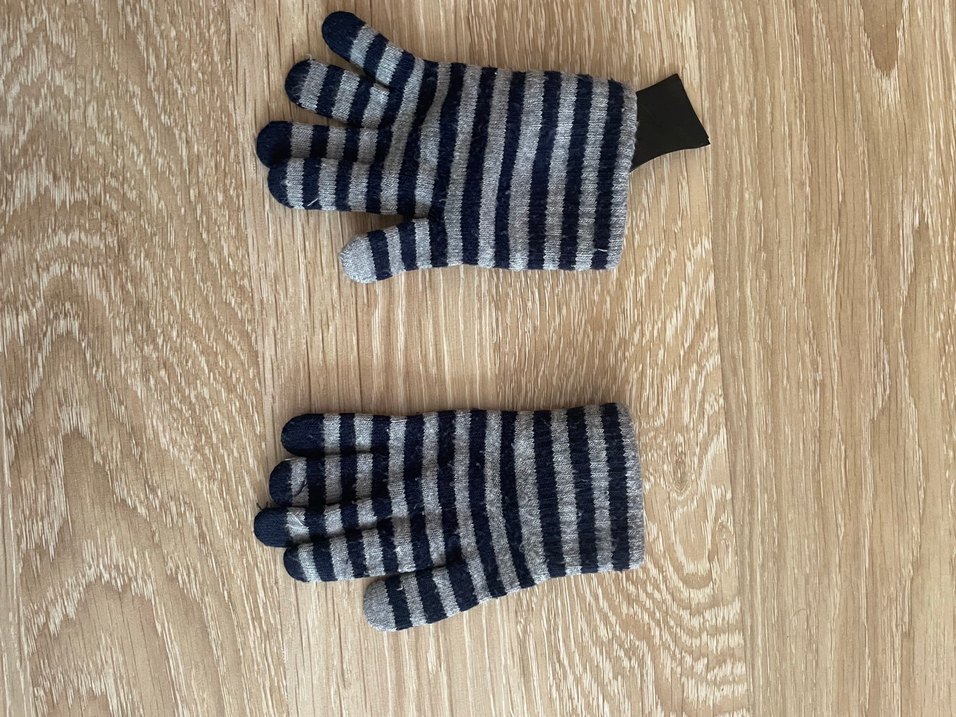 Gri ve lacivert çizgili, örgü kumaştan yapılmış çocuk eldivenleri, rahat ve sade bir sokak stili sunar.