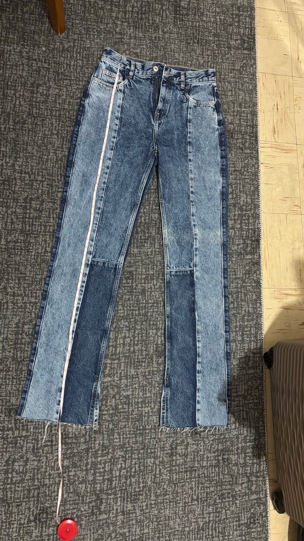 Çizgili gri denim kadın pantolon, kemerli ve normal kesim. Sokak stili ve günlük kullanım için midi boyda rahat bir seçenek.