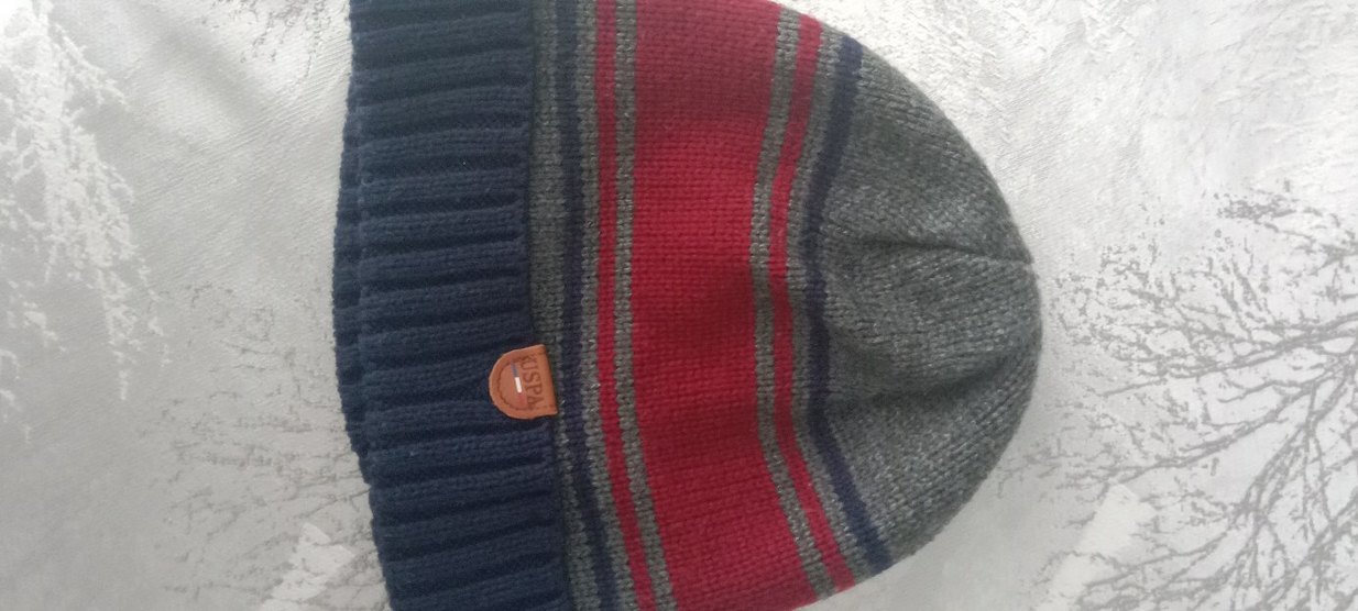 Gri, kırmızı ve lacivert çizgili, yumuşak ve rahat kumaştan erkek bere. Küçük deri logo detayı bulunur. uspa