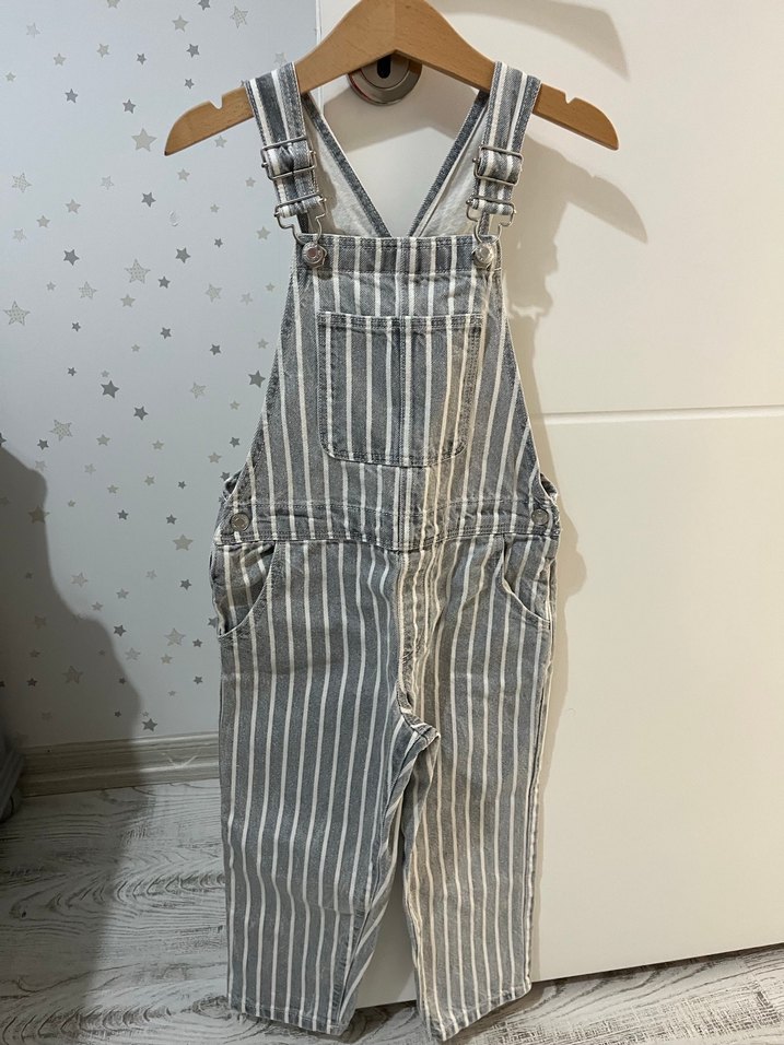 Gri çizgili kot kumaştan, ayarlanabilir tokalı askılı ve regular fit erkek çocuk salopeti, streetwear tarzında.