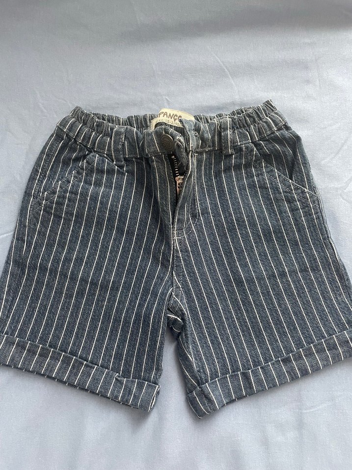 Gri çizgili desenli, bol kesim denim erkek şort, ayarlanabilir tokasıyla rahat kullanım sağlar.
