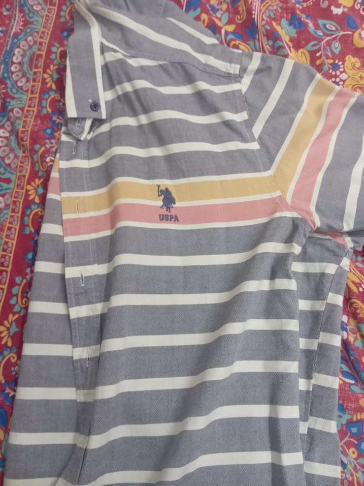 Gri ve çok renkli çizgili, uzun kollu erkek gömleği. Yakalı, düğmeli ve bol kesimdir. Yumuşak sentetik kumaştan üretilmiştir.