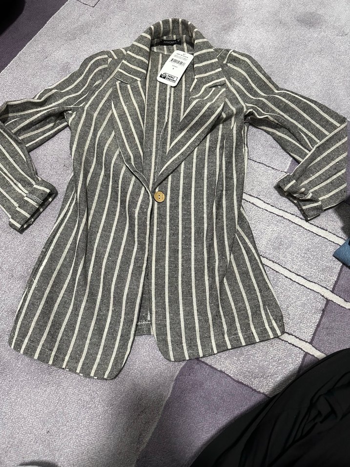 Düğmeli, kesik yaka ve normal kesime sahip bu kadın blazer ceket, keten kumaştan üretilmiştir. Uzun kollu ve gri çizgili olup ofis kullanımı için uygundur.