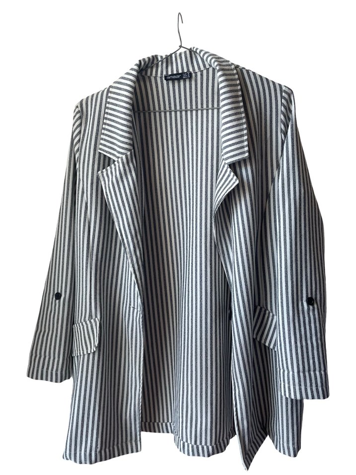 Gri çizgili kadın keten blazer ceket, kesimli yakalı, düğmeli ve uzun kolludur. Ofis ve günlük kullanıma uygun, midi boy ve regular fit.