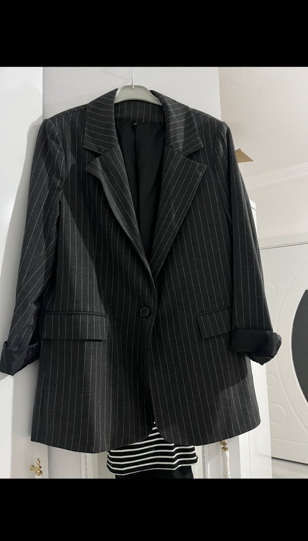 Gri çizgili kadın blazer ceket, çıtmalı uzun kollu ve normal kesimdir. Midi boyda, iş ve günlük stil için uygundur. Sentetik kumaştan üretilmiştir.