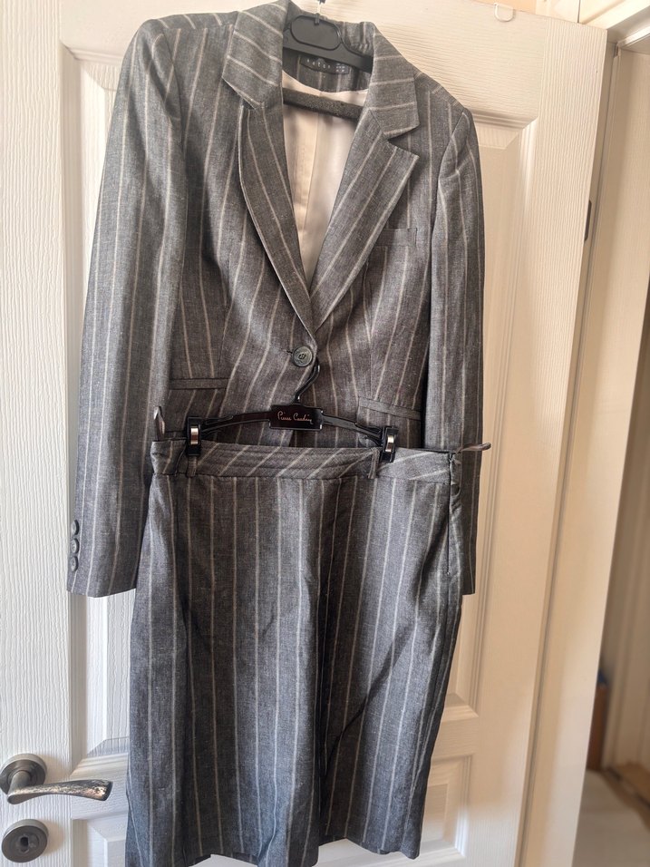 Çizgili gri kadın ofis takımı, notched lapel yakalı, uzun boylu ve kemerli bel detayına sahiptir. , modern klasik tarzda,