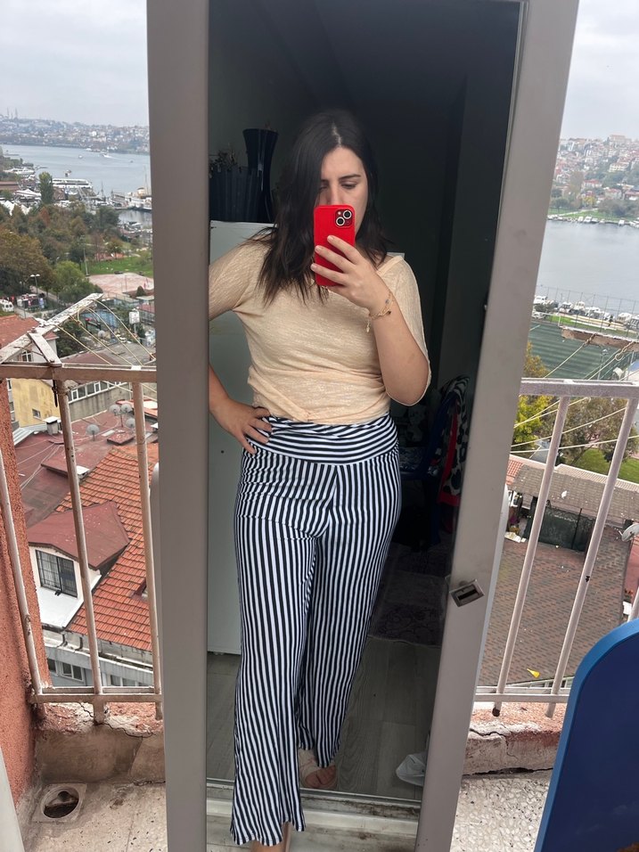 Pamuk kumaştan, çizgili ve gri renkte, midi boy ve vücuda oturan kadın sigara pantolon, rahat ve şık bir günlük stil sunar. ✨