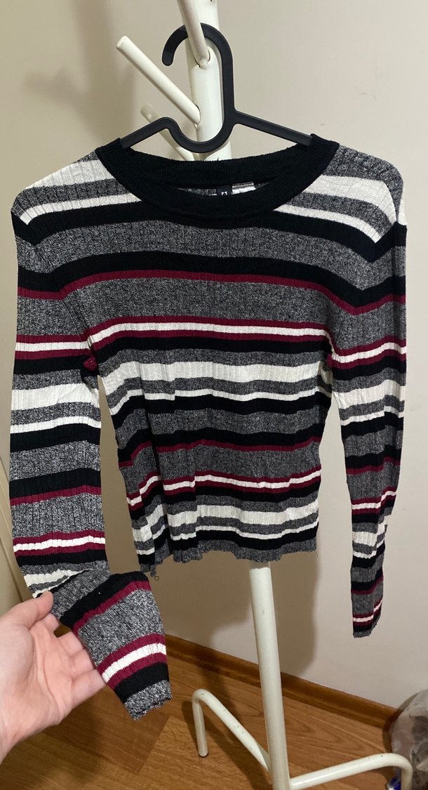 Uzun kollu, bisiklet yaka ve çizgili desenli, gri tonlarında rahat ve fit kesim kadın triko kazak. Günlük kullanıma uygundur.