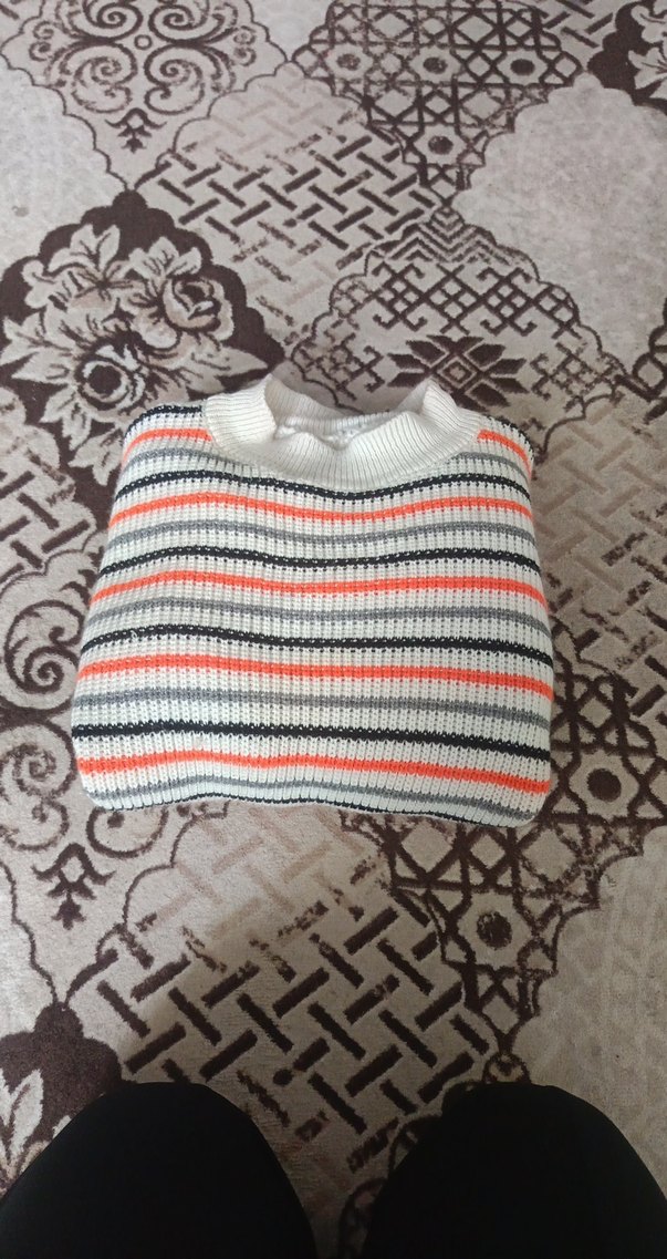 Gri renkli, uzun kollu, tekne yaka ve çizgili desene sahip, bol kesim kadın triko kazak. Rahat ve şık, günlük kullanıma uygun.