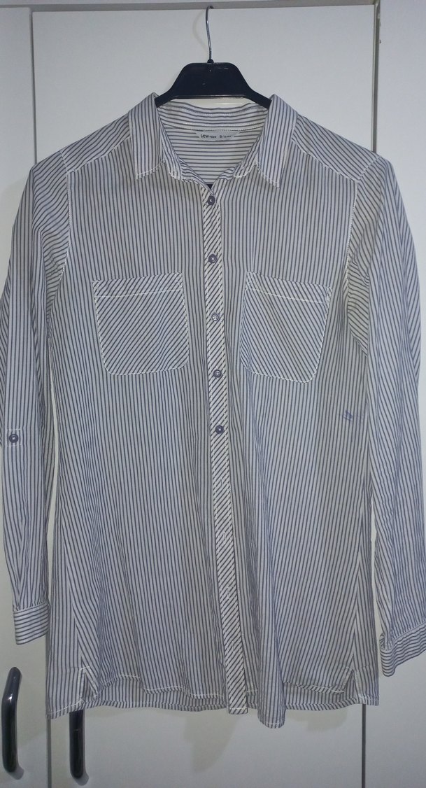 Çizgili gri ve beyaz renkte, pamuk kumaştan yapılmış, düğmeli uzun kollu, normal boyda ve regular fit kadın gömleği. Ofis ve günlük kullanıma uygundur. Boya lekesi vardır geçicidir.