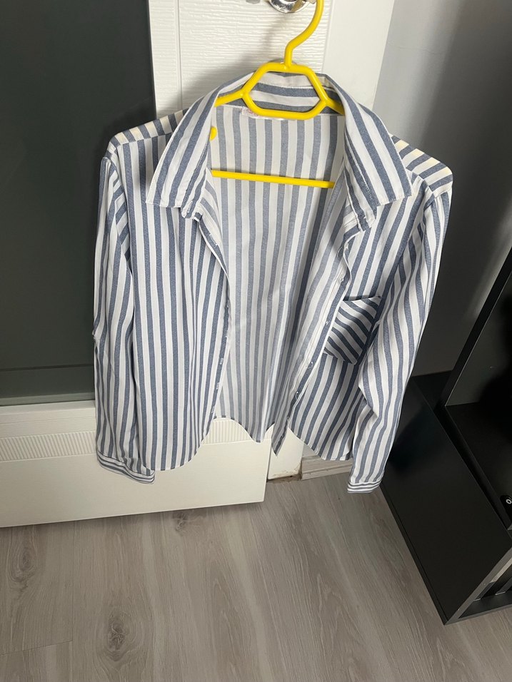 Gri çizgili, keten kumaştan yapılmış, düğmeli ve uzun kollu kadın gömleği. Regular fit ve yakalı tasarımıyla günlük kullanıma uygundur. M-L uyumlu