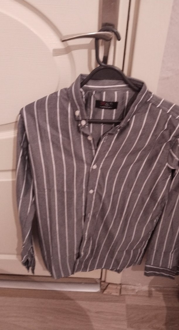 Uzun kollu, düğmeli ve yakalı gri çizgili keten kadın gömleği. Rahat kesimiyle günlük kullanıma uygundur.