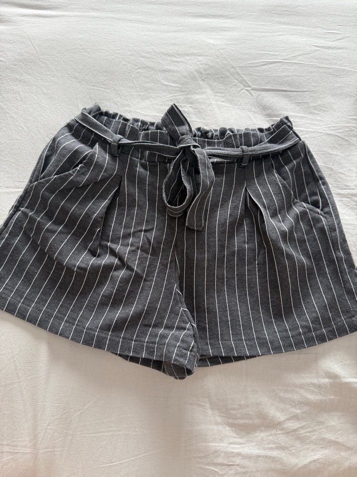 Yumuşak keten kumaştan, bol kesim gri çizgili mini şort. Kemerli beli rahat ve günlük kullanıma uygun.