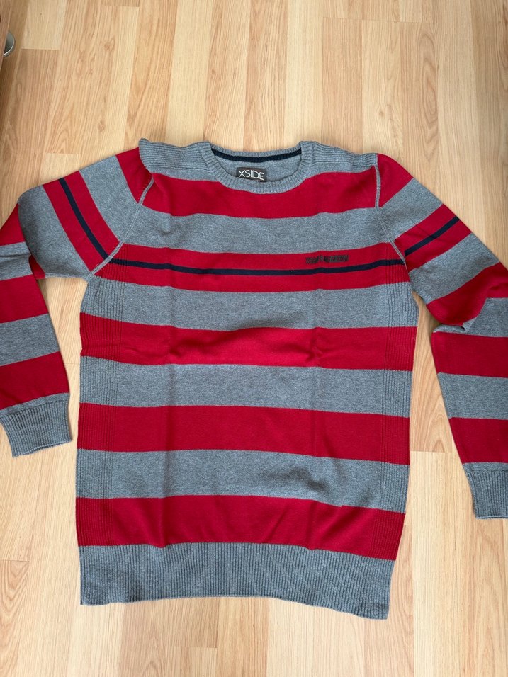 Uzun kollu, yuvarlak yaka, yün kumaştan yapılmış, gri ve kırmızı çizgili, fitted kesim erkek triko kazak.