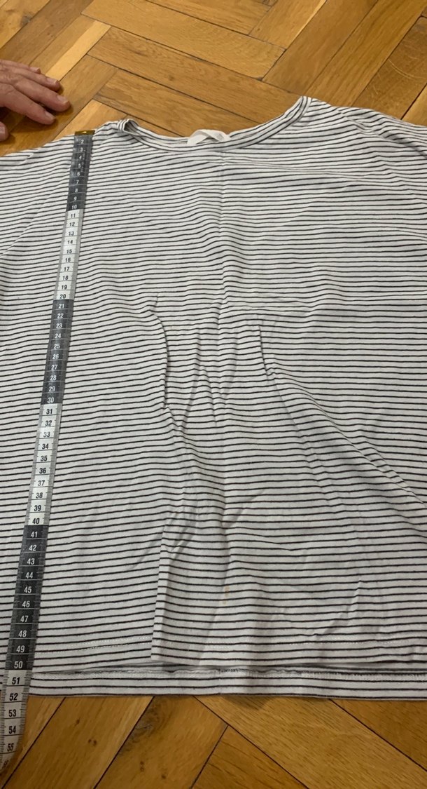 Çizgili desenli, uzun kollu ve kayık yakalı tişörtü, yumuşak sentetik kumaştan üretilmiş. Yırtmaç detayı ve midi boyda, günlük sokak stiline uygun.