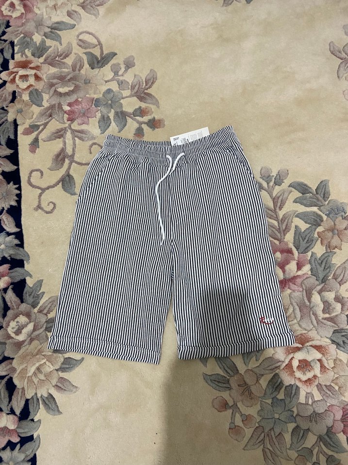 Gri renkli, çizgili desene sahip, pamuklu kumaştan üretilmiş, rahat kesim erkek şort. Belinde lastik ve bağcık bulunur. Günlük kullanıma uygundur.