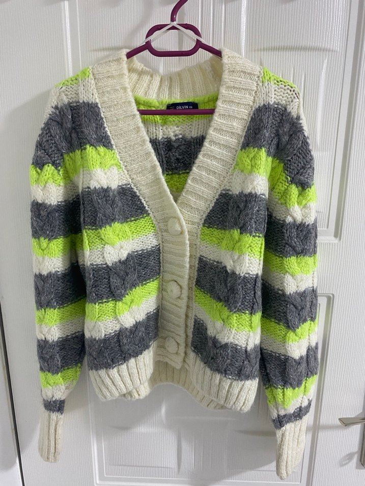 Bu örgü hırka, gri, beyaz ve neon sarı çizgili deseniyle bol kesim, uzun kollu ve midi boydadır. Yüksek yakalı, rahat sokak stili için uygundur.