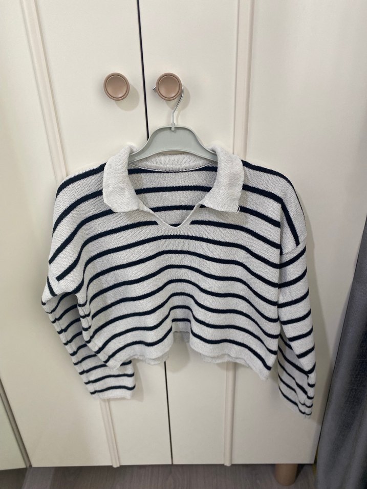 Gri renkli, çizgili triko kadın kazak. Yaka detaylı, uzun kollu ve bol kesimdir. Günlük kullanıma uygun, rahat bir sokak stili parçası.