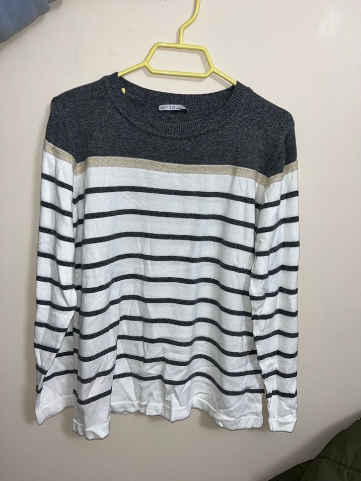 Gri renkli, uzun kollu ve yuvarlak yaka, siyah ve bej çizgili örgü triko kazak. Rahat kesimiyle günlük kullanıma uygundur.Yeni ve kullanılmamıştır.