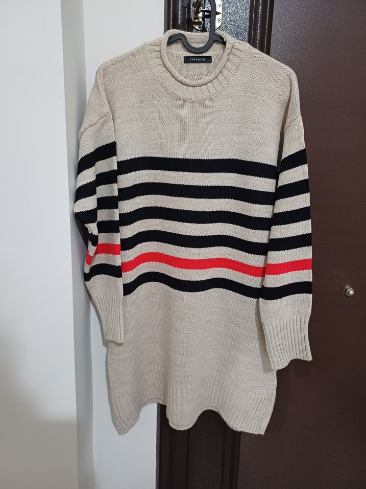 Gri, siyah ve kırmızı çizgili, uzun kollu, uzun kesim, yuvarlak yaka ve rahat kesime sahip örme kadın kazak. Günlük kullanıma uygun.