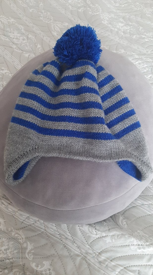 Üstünde ponpon bulunan kulaklıklı, gri ve mavi çizgili örgü erkek bere. Sıcak tutan yumuşak örgü kumaştan yapılmıştır.