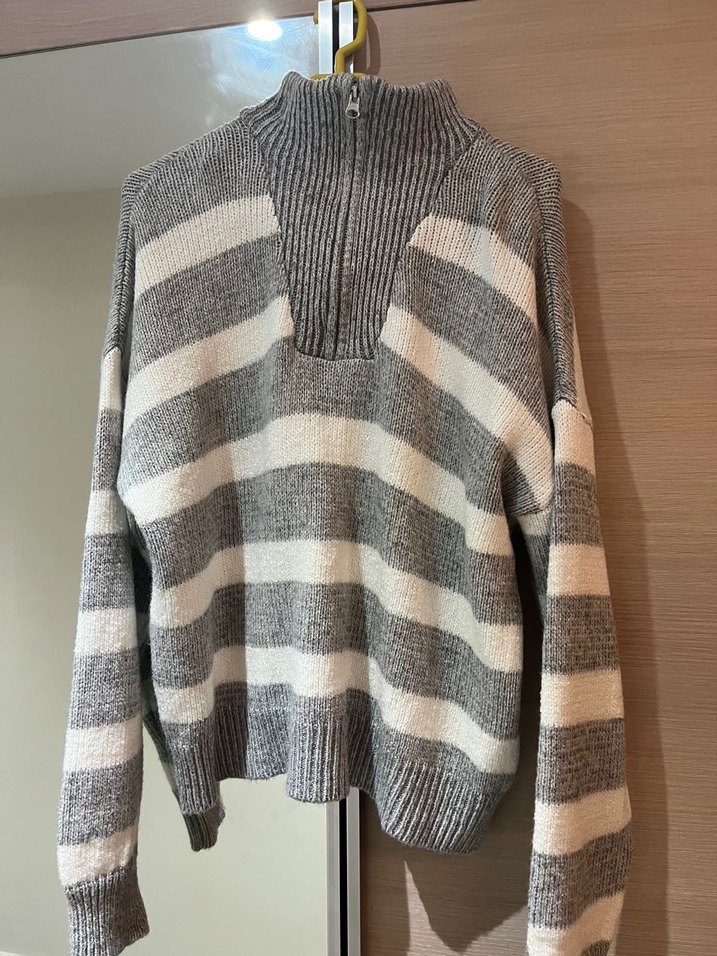 Yumuşak örgü kumaştan, yüksek yakalı ve uzun kollu, gri beyaz çizgili, bol kesim kadın kazak. Günlük rahat kullanıma uygundur.