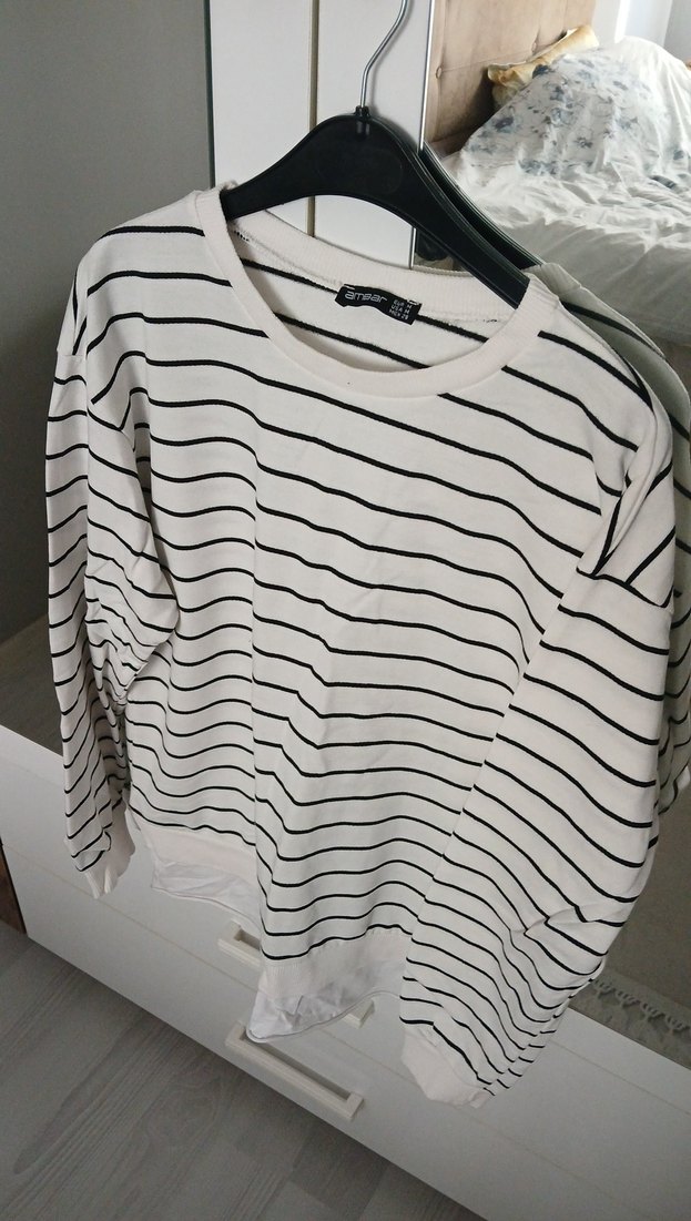 Pamuk kumaştan, beyaz ve gri çizgili, uzun kollu, yuvarlak yaka, bol kesim hamile tişörtü. Günlük rahat kullanım için uygundur.