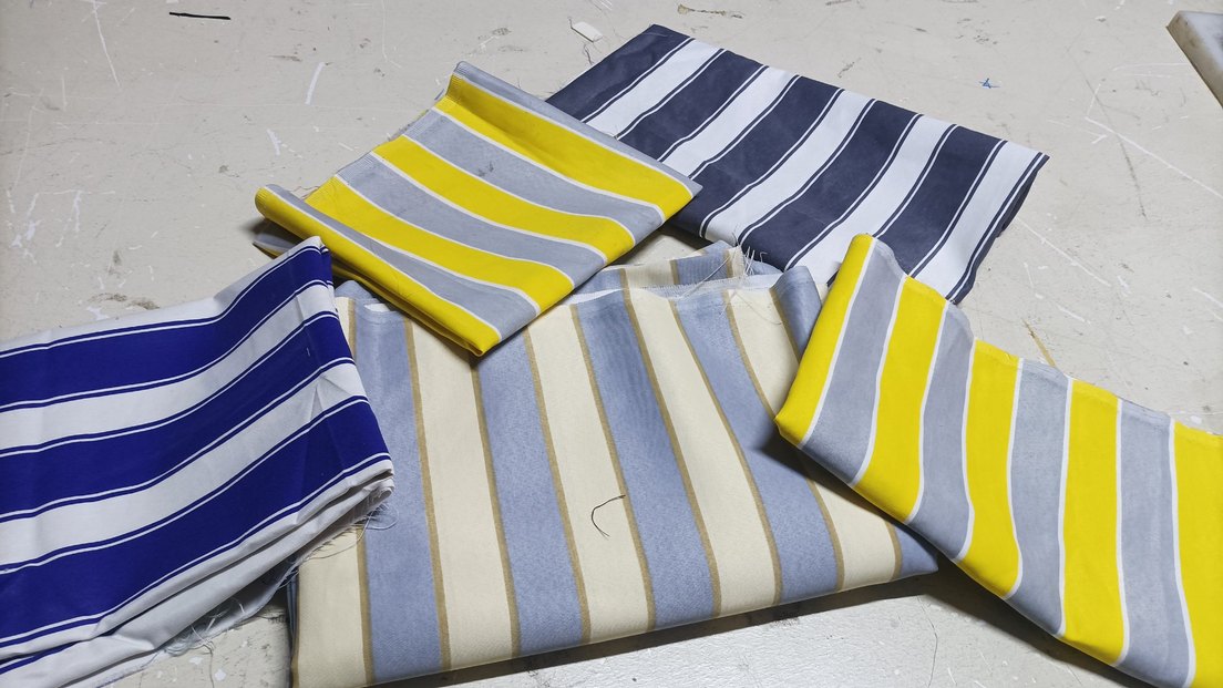 Canlı gri, mavi ve sarı renklerde çizgili balkon perdesi ve demirlik perde dikilir metresi 110₺