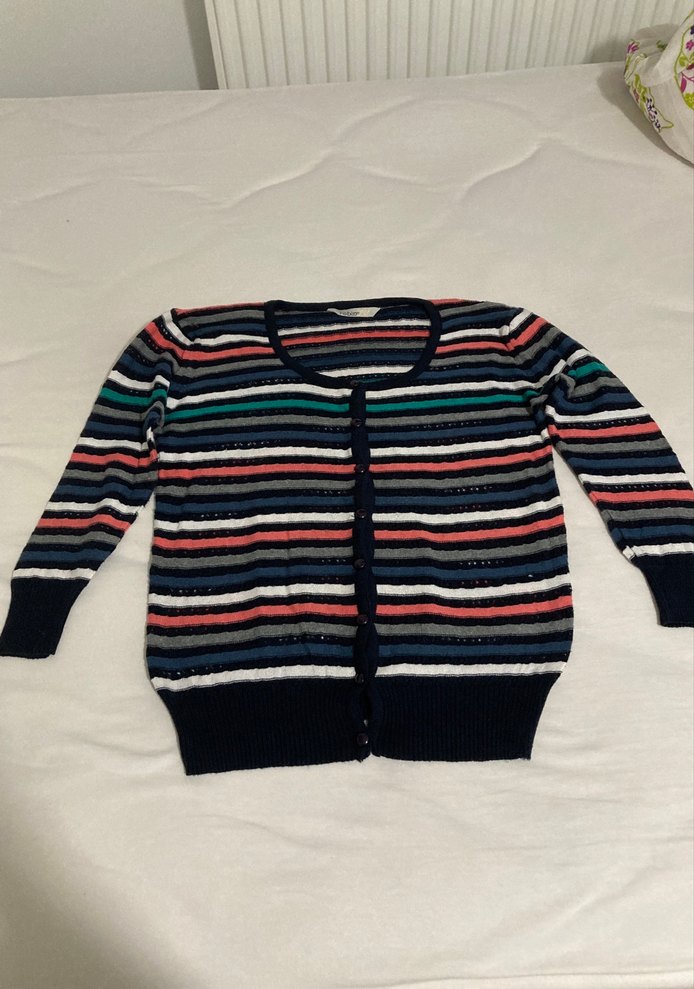 Fitted kesim, uzun kollu ve yuvarlak yakalı hamile hırkası, yumuşak triko kumaştan, koyu renkli çok renkli çizgili, günlük rahat kullanıma uygun. S-M beden uygun yeni.