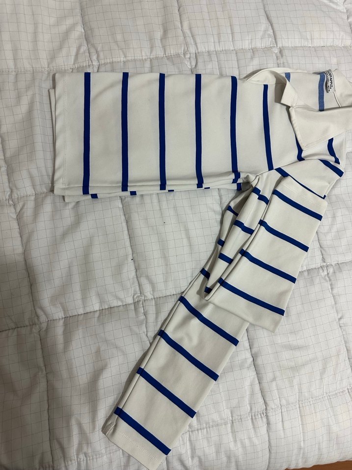 Çizgili, uzun kollu, yakalı ve kadın badi . Beyaz zemin üzerine mavi çizgilerle midi boyda, streetwear ve athleisure tarzı bir model.