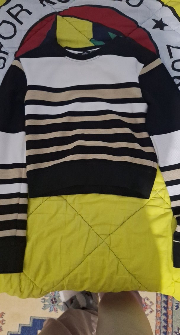 Dar kesim, uzun kollu ve yuvarlak yaka kadın mini sweatshirt. Yumuşak sentetik kumaştan, koyu renk çoklu çizgili ve elastik etek ucu ile rahatlık sağlar.