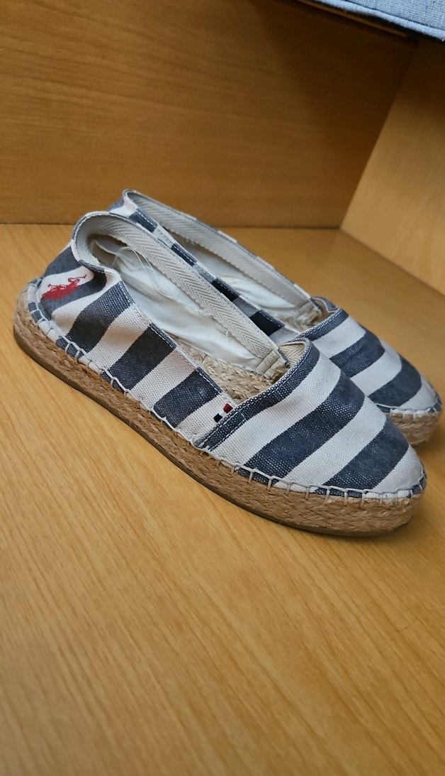 Beyaz ve gri çizgili denimden, pileli detaylı kadın dolgu topuklu espadril. Bohem tarzıyla günlük rahatlığı birleştirir.