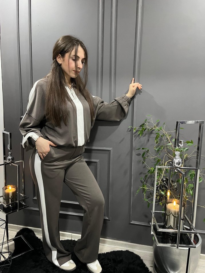 çizgili kadın eşofman takımı, yüksek yakalı ve uzun kolludur. İpek gibi kumaştan üretilmiş, normal boy ve regular fit kesime sahiptir. şık ve rahat bir tercih olup günlük kullanıma uygundur.
