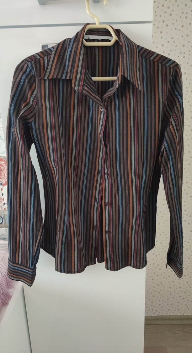 Düğmeli, uzun kollu ve yakalı kadın gömlek. Koyu renkli çok renkli çizgili deseni ve normal kesimiyle ofis ve günlük kullanıma uygundur. Yumuşak tekstil kumaştan üretilmiştir.