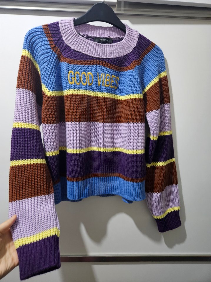Pastel renkli çizgili, triko kazak. Önünde 'GOOD VIBES' yazısı işlemeli, yuvarlak yaka ve uzun kollu.