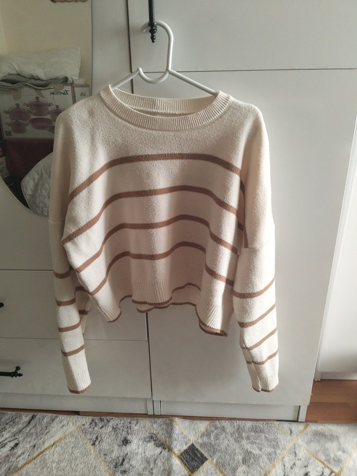 Uzun kollu ve yuvarlak yakalı örgü kazak. Rahat kesimi ve hafif çizgili deseniyle günlük kullanıma uygundur. L/XL beden uyumludur