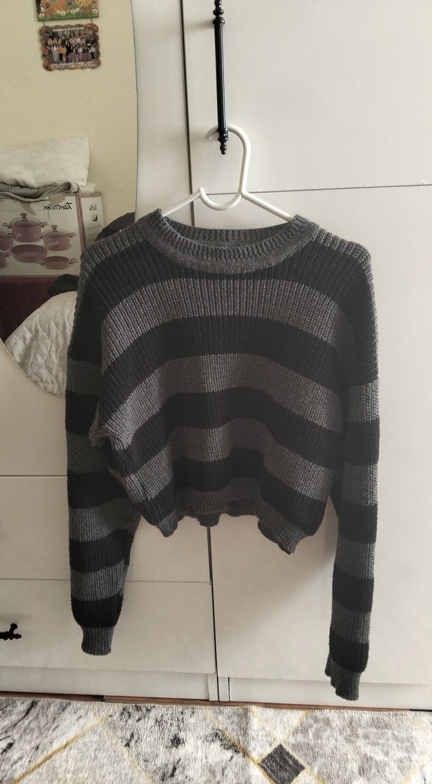 Gri-siyah çizgili, uzun kollu ve yuvarlak yakalı kazak, rahat kesimi ve midi boyu ile günlük kullanıma uygun, rahat ve şık bir parçadır. L/XL beden uyumludur