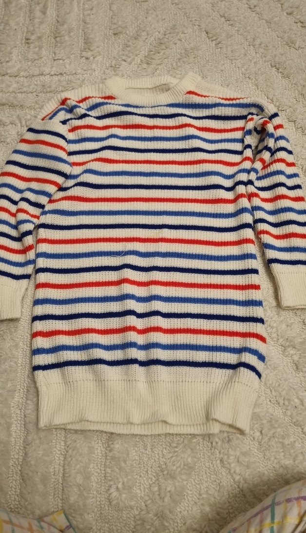 Bu vücuda oturan kadın kazağı uzun kollu ve bisiklet yakadır, açık renkli çok renkli çizgili desene sahiptir. Midi boyu günlük sokak stiline bohem ve retro hava katar.