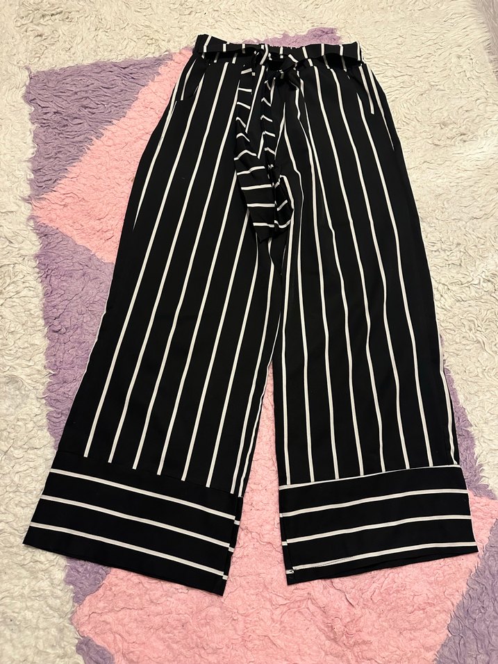Siyah renkli, beyaz çizgili, bol kesim ve pilili uzun kadın kumaş pantolon. Belde bağlama detaylı, günlük sokak stiline uygun.