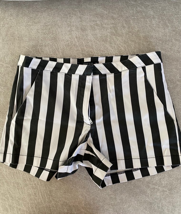 Düzgün sentetik kumaştan, cesur siyah beyaz çizgili, pile detaylı, dar kesim mini kadın şort, açık hava sokak giyimi için uygun.