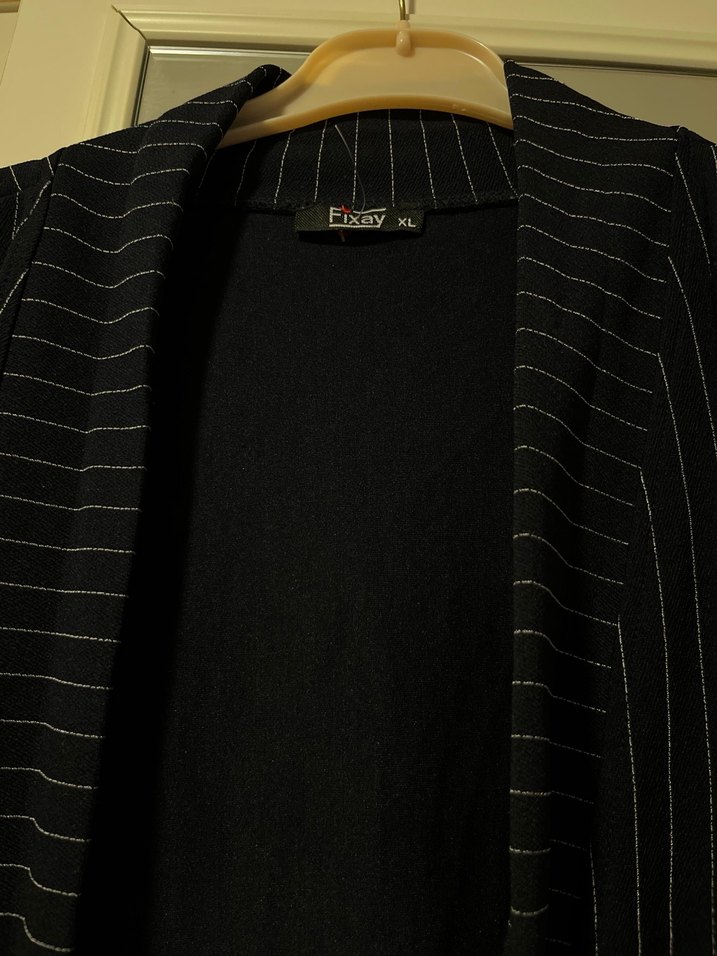 Düğmeli, uzun kollu, siyah çizgili kadın blazer. Notlu yaka ve regular kesime sahip, iş ve günlük şıklık için uygun. ✨