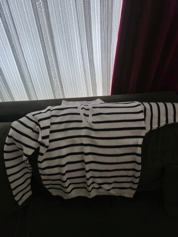 Triko örme, beyaz zemin üzerine gri çizgili, kayık yaka ve uzun kollu, bol kesim kadın bluz. Sokak stiline uygun, günlük kullanıma elverişli.