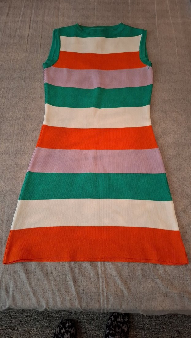 Kolsuz ve çizgili bu triko elbise, pastel renklerde ve tekne yakalıdır. Yumuşak likralı ve sentetik kumaştan, bohem tarz için uygundur. Boy: 82cm Bel:35cm standart beden iade yoktur