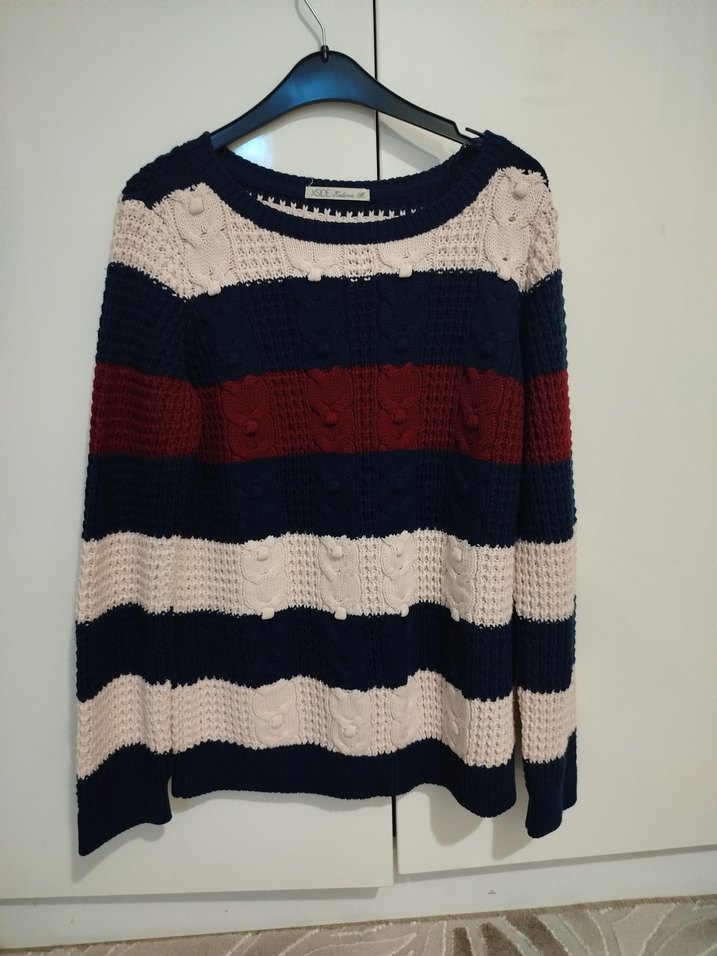 Kadınlar için çizgili, uzun kollu, yuvarlak yaka, bol kesim triko kazak. Koyu renklerde ve rahat bir tasarıma sahiptir.
