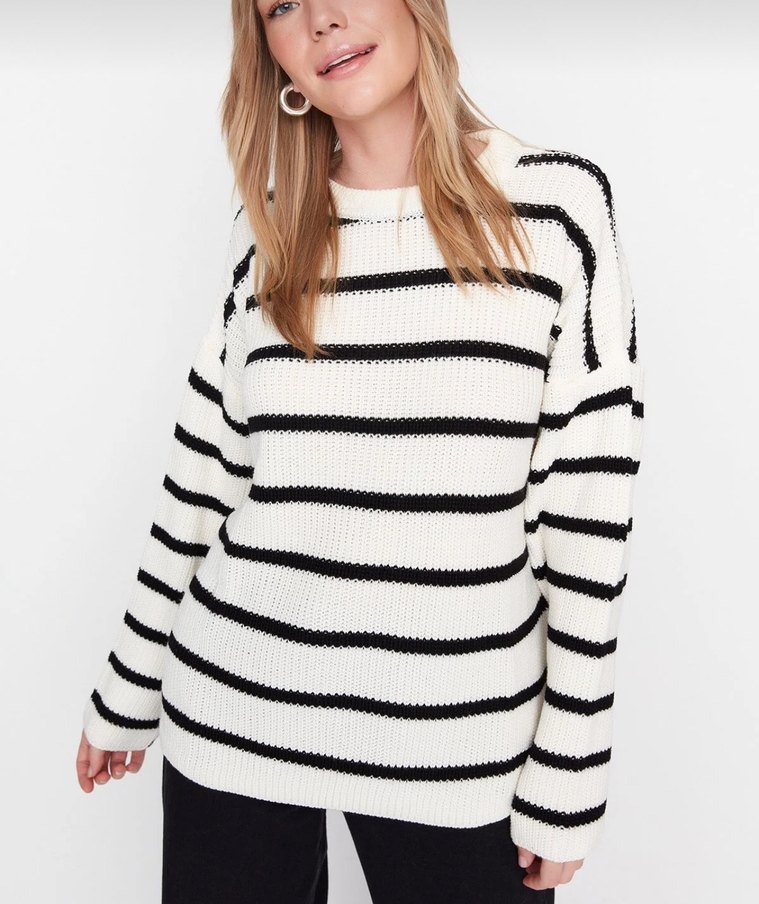 Kadınlar için çizgili, uzun kollu, yuvarlak yaka, bol kesim triko kazak. Beyaz zemin üzerine gri çizgilerle rahat ve günlük stil sunar.