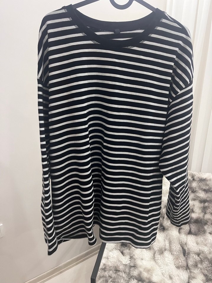 çizgili ve uzun kollu kadın kazak. Salaş kesim,yuvarlak yaka