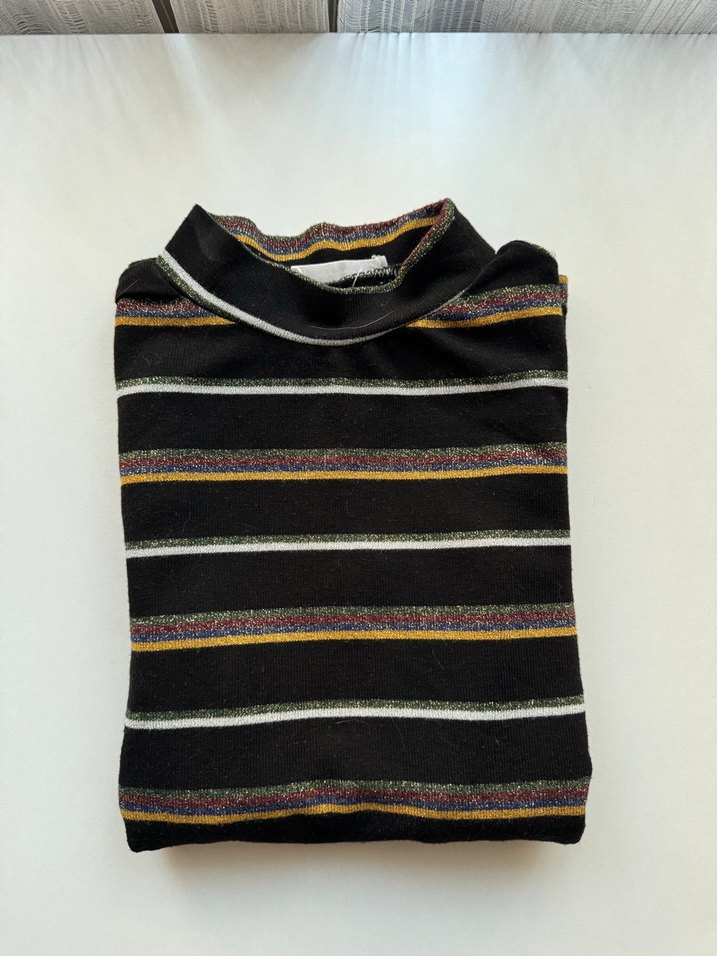 Yarım balıkçı yaka, uzun kollu ve vücuda oturan kesime sahip bluz. Triko dokulu, çok renkli çizgili deseniyle sokak stiline uygundur.